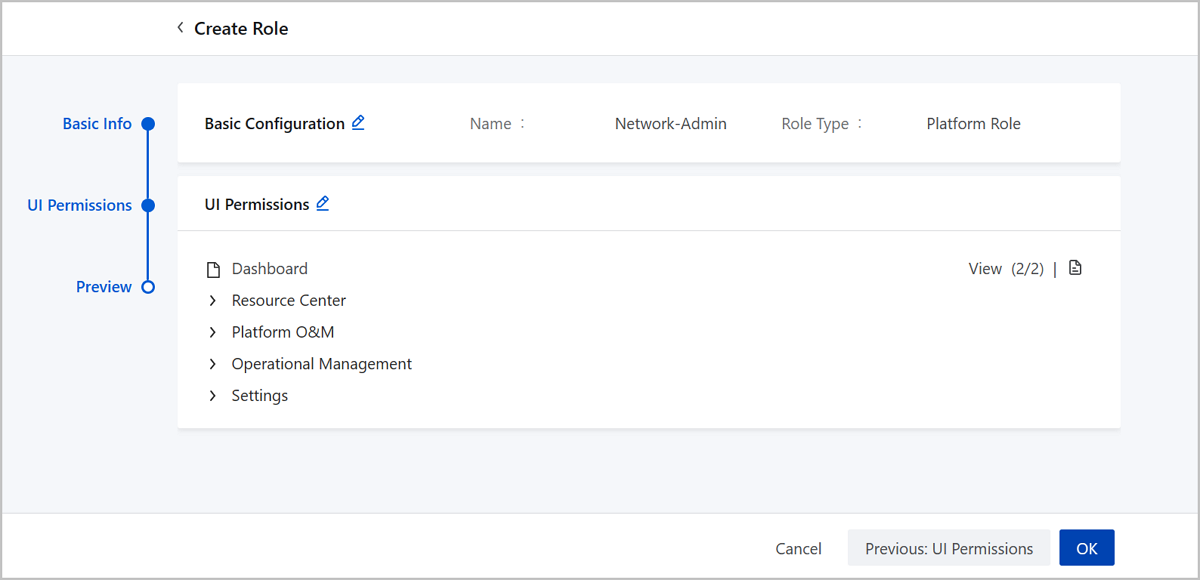 Select the module permissions and configure these UI permissions according to the permission list for network admin role above.