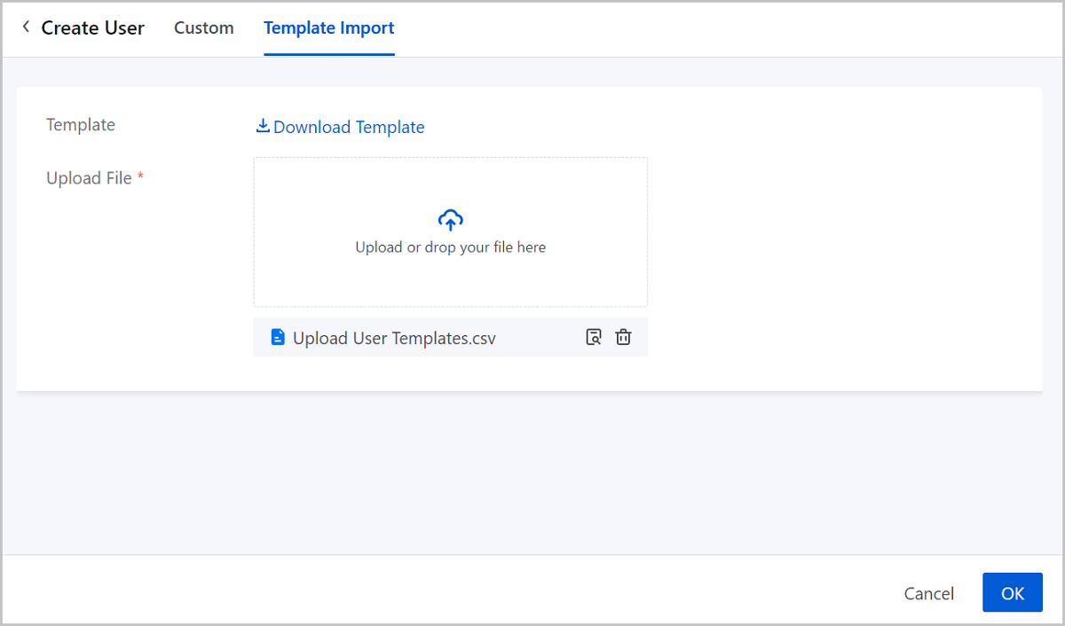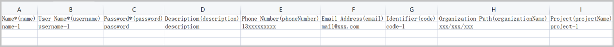Note: User name, name, and password are required parameters, and the user name must be globally unique.The user template includes a header and an example row, which needs to be deleted or overwritten when editing the template.