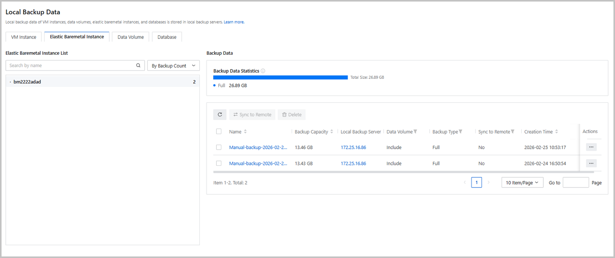 Note: If the selected backup data is the whole backup data of the elastic baremetal instance, you can restore the instance with its volumes to the local server. This helps ensure the data consistency.