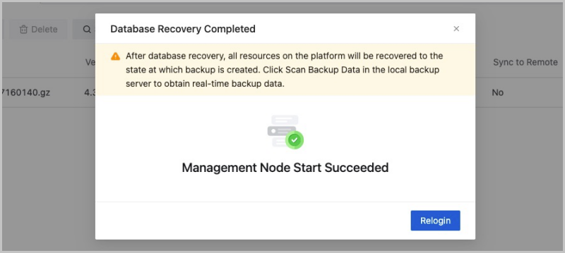 Note: After the database is restored, all resources of the Cloud are back to the original state before the backup. You can click Scan Backup Data in the local backup server page to obtain the actual backup data information.