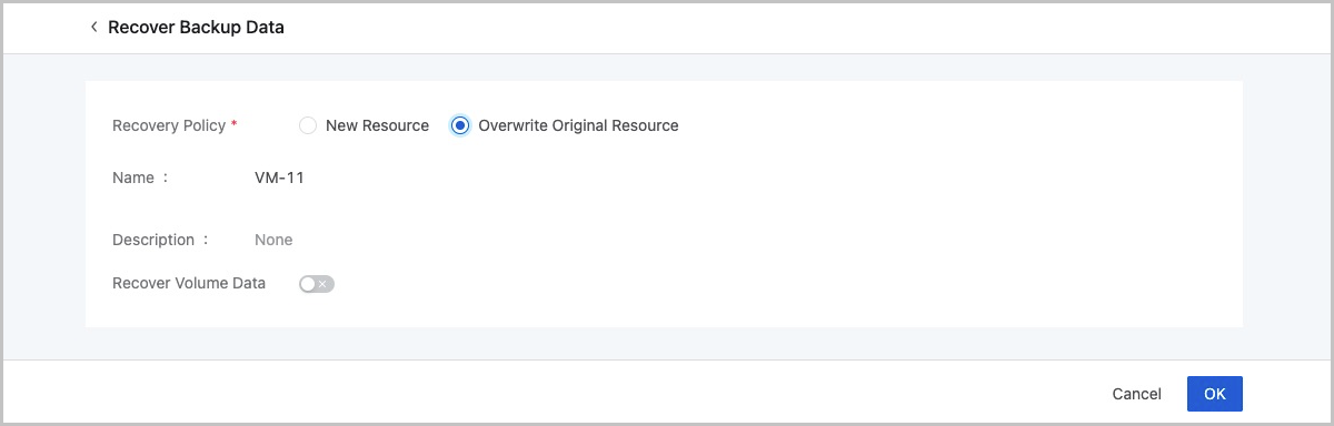 Note: If the selected backup data is the whole backup data of the VM instance, you can restore the VM instance with its volumes to the local server. This helps ensure the data consistency.