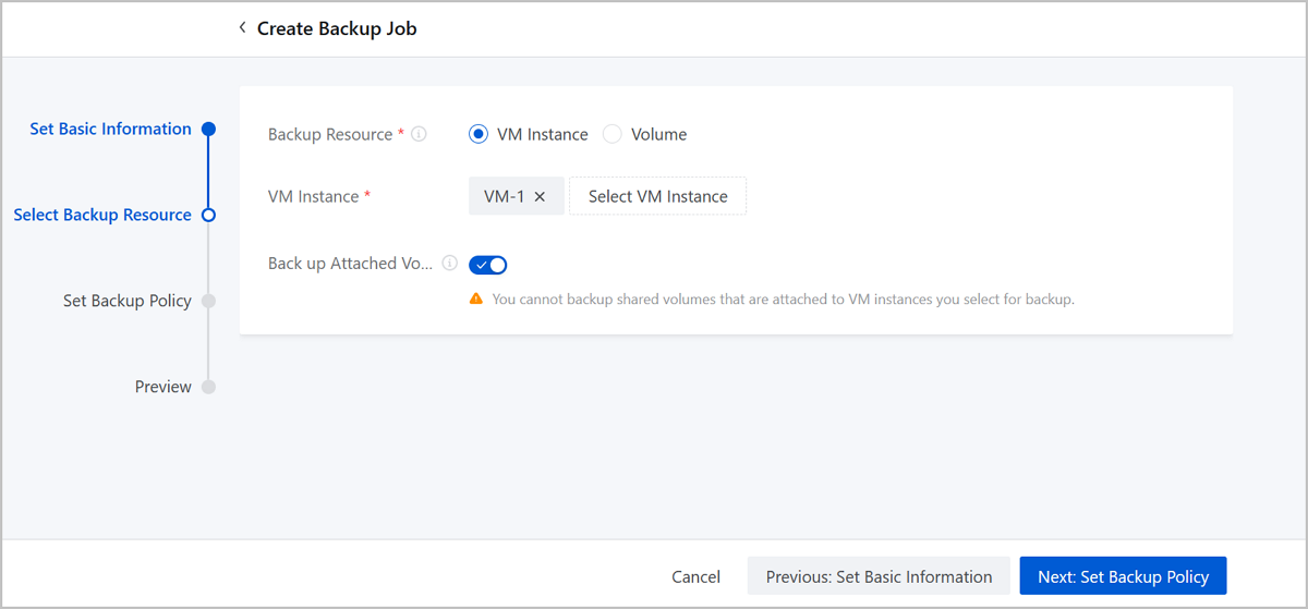 On the main menu of ZStack Cloud, choose . Then the Backup Job page appears. On the page, choose . Then, the Create Backup Job page is displayed.