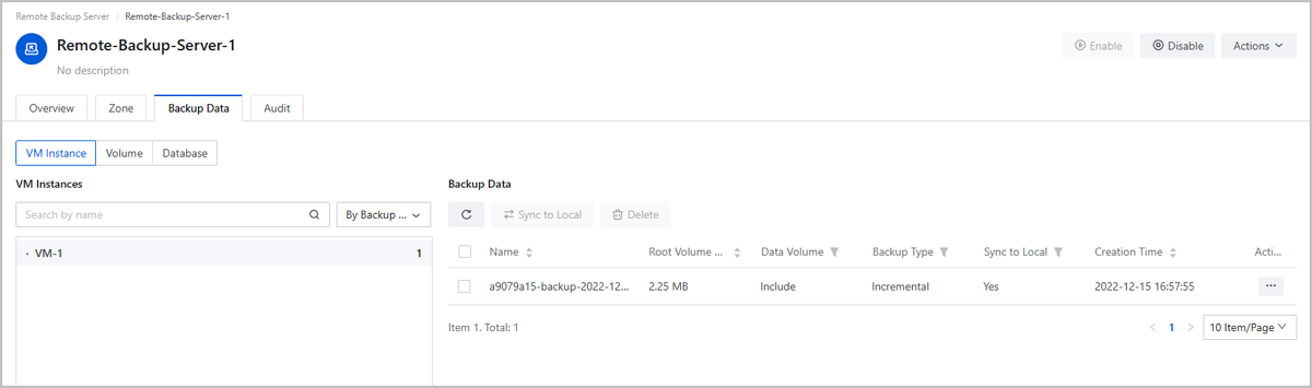 Assume that you have deployed the latest ZStack Cloud environment on local and purchased both the Base License and the Plus License of Backup Service. Now, you plan to add a local backup server and a remote backup server to backup a service VM instance with non-shared volumes. The data is backed up to the local backup server and synced to the remote backup server in Zone-1. Assume that you have mistakenly expunged a service VM instance causing Web service interruption (http://192.168.1.1) and data loss. In addition, the local backup server is destroyed, so you have to recover backup data from the remote backup server. After data is recovered, both the service and data are back to normal.