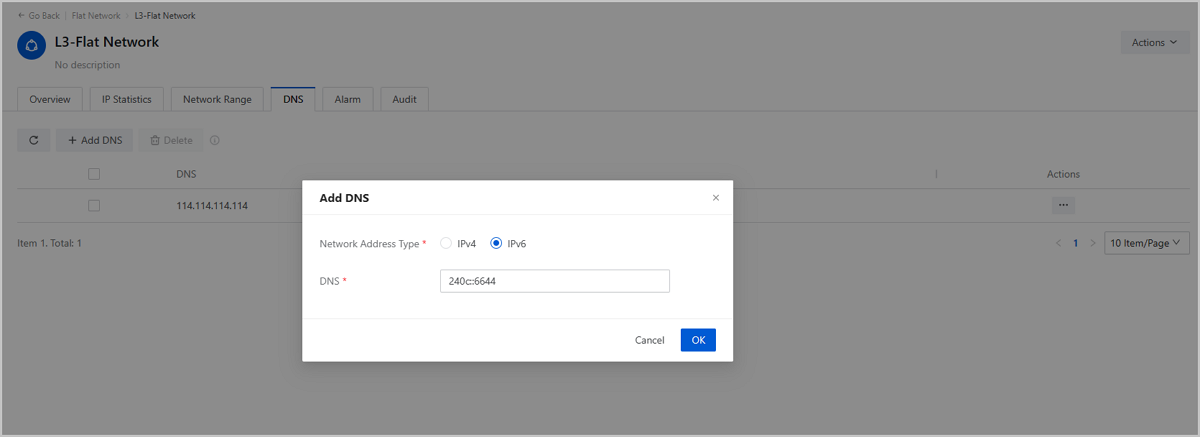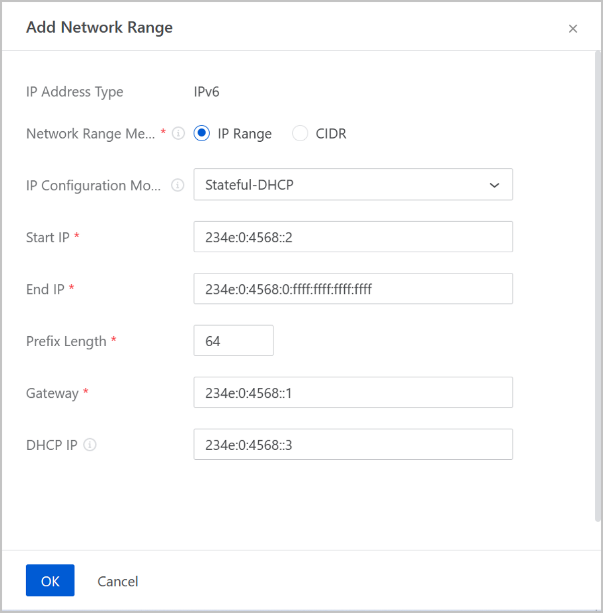 Note: You can also create an IPv6 flat network first, and then add an IPv4 range to a flat network.Add an IPv6 range to the existing IPv4 network to form an IPv4+IPv6 dual-stack network.