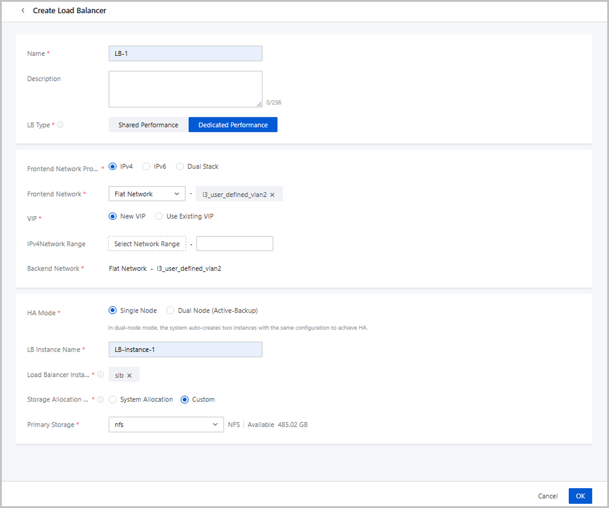 On the main menu of ZStack Cloud, choose . On the Load Balancer page, click Create Load Balancer. The Create Load Balancer page appears.