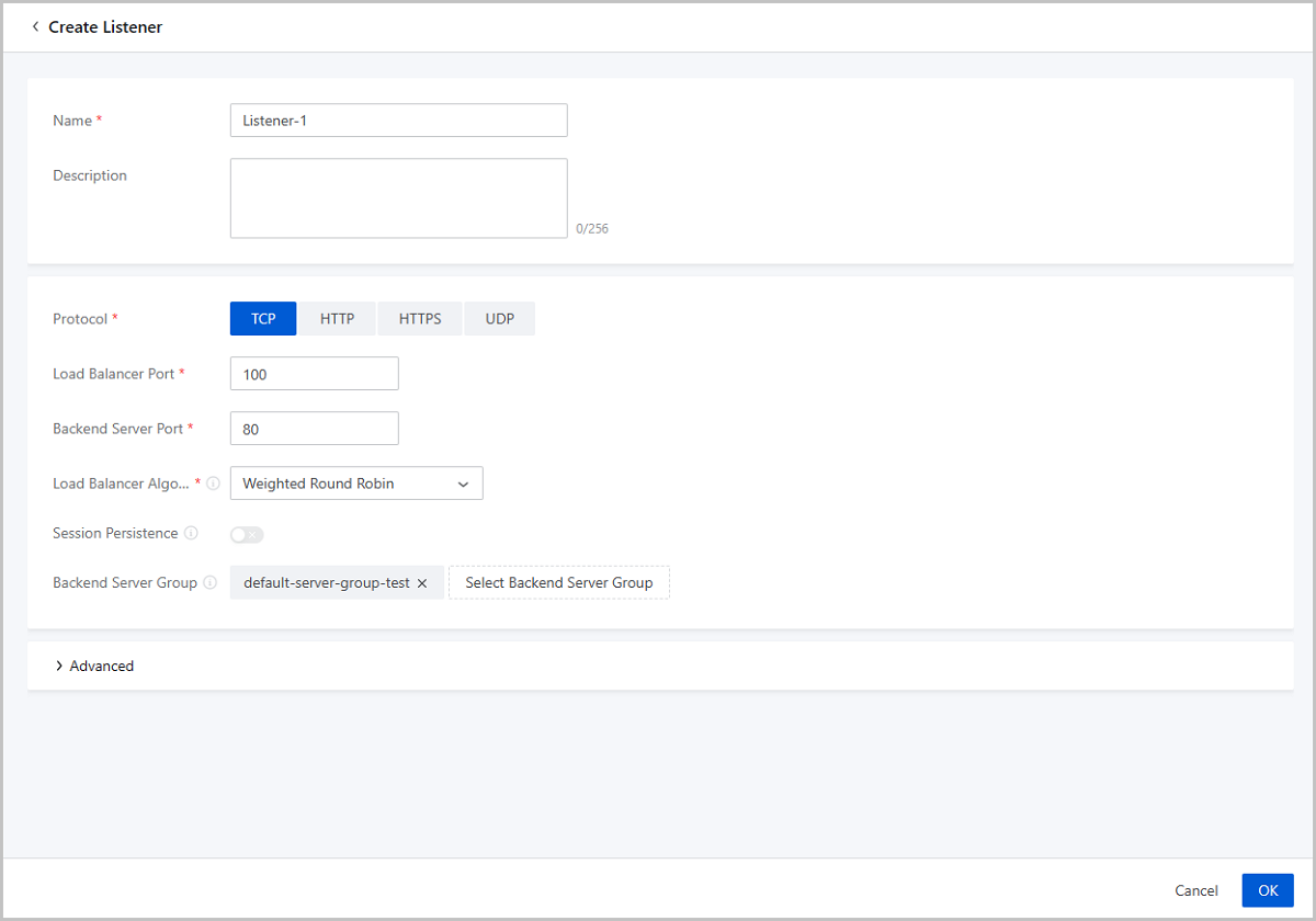 On the details page of the load balancer, click the Listener tab. On the tab, click Create Listener. The Create Listener page is displayed.