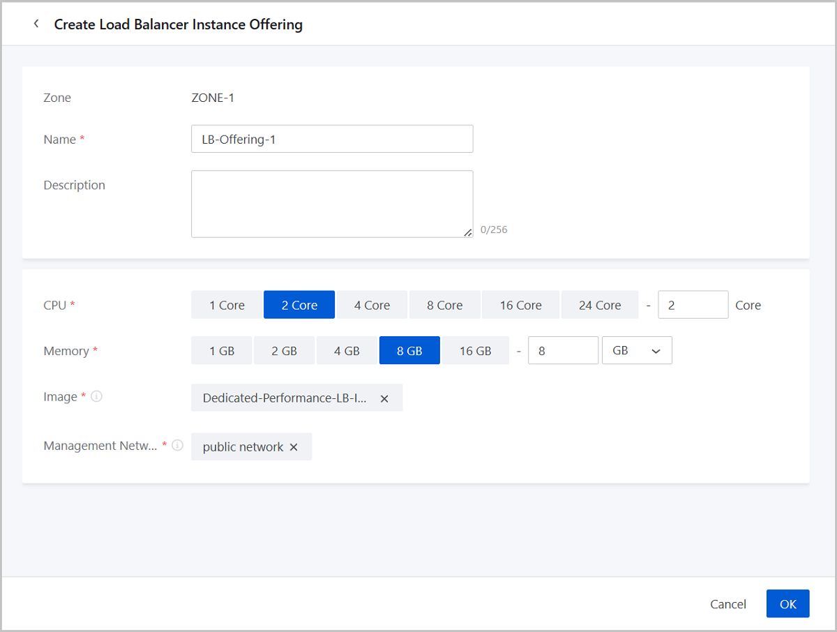 On the main menu of ZStack Cloud, choose . On the Offering tab, click Create Load Balancer Instance Offering. The Create Load Balancer Instance Offering page is displayed.