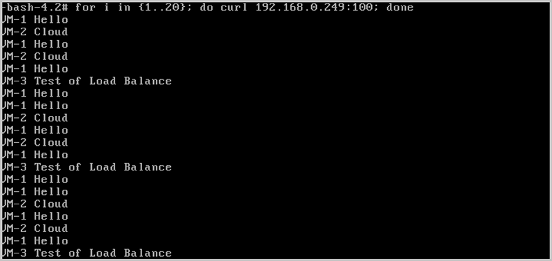 In this scenario, we will run the curl command in the port 100 of the VIP address (192.168.0.249) of the load balancer: for i in {1..20}; do curl 192.168.0.249:100; done.