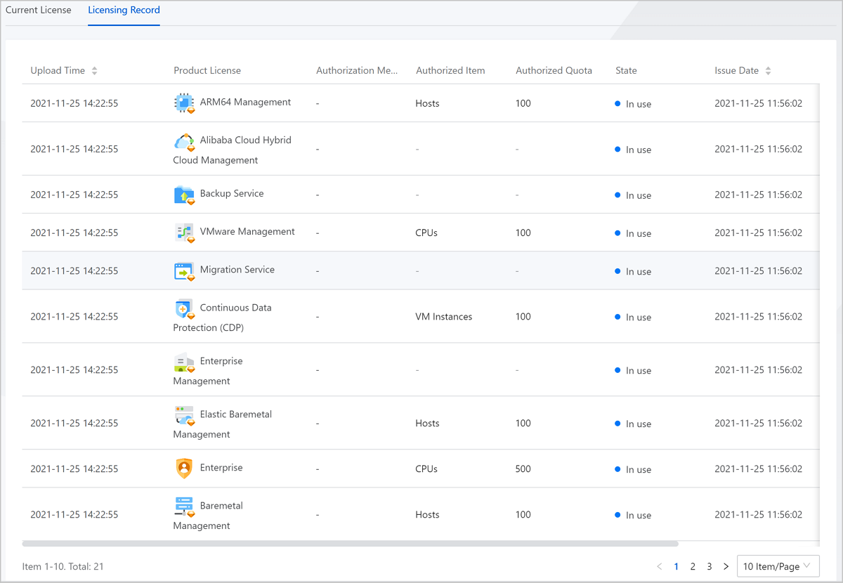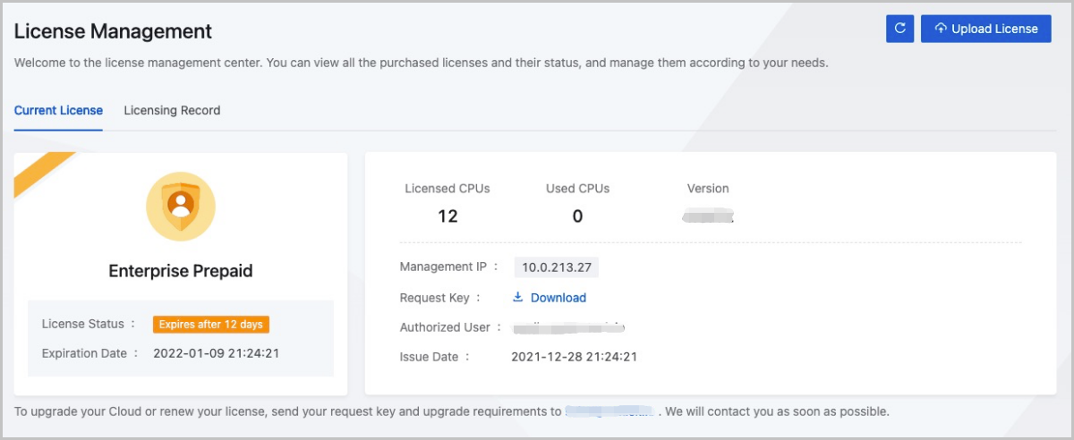 The admin can view the licensing records of the Cloud on the UI, including the upload time, license type, authorized items, authorization method, authorized quota, state, time when the license was issued, and time when the license expires.