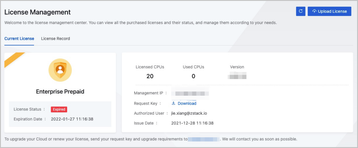 On the main menu of ZStack Cloud, choose . Then, the Licensing Record page is displayed.