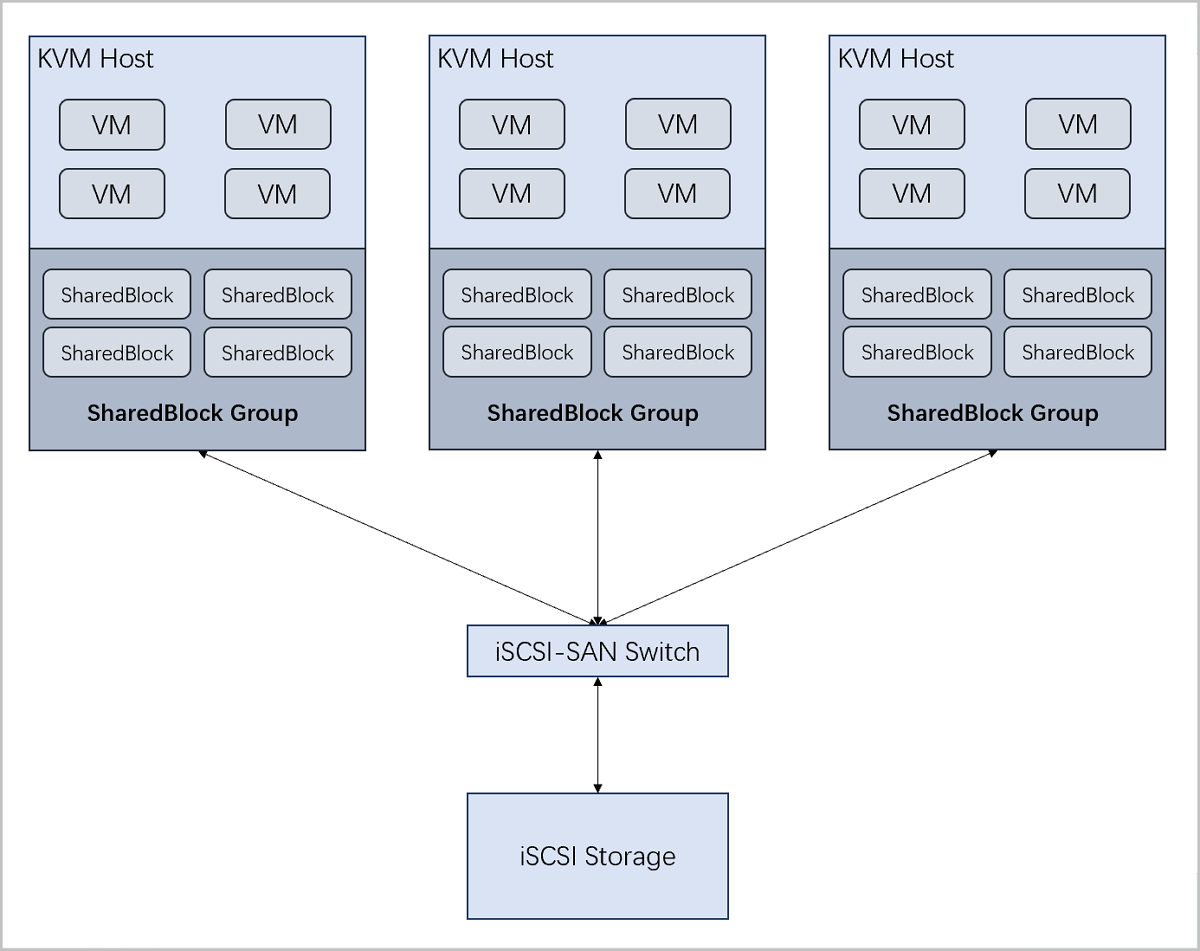 For better understanding, the above topology is based on a single-link scenario. If you deploy a SharedBlock storage in a production environment, we highly recommend you use a dual-controller iSCSI storage and enable the high availability mode of the storage network to ensure redundancy.