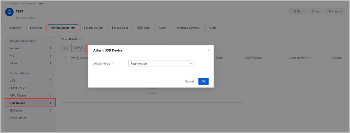 Note: On the main menu of ZStack Cloud, choose . On the VM Instance page, choose a VM instance and enter its details page. Then, choose to enter the details page where you can attach USB devices by clicking Attach. Then, follow these steps: