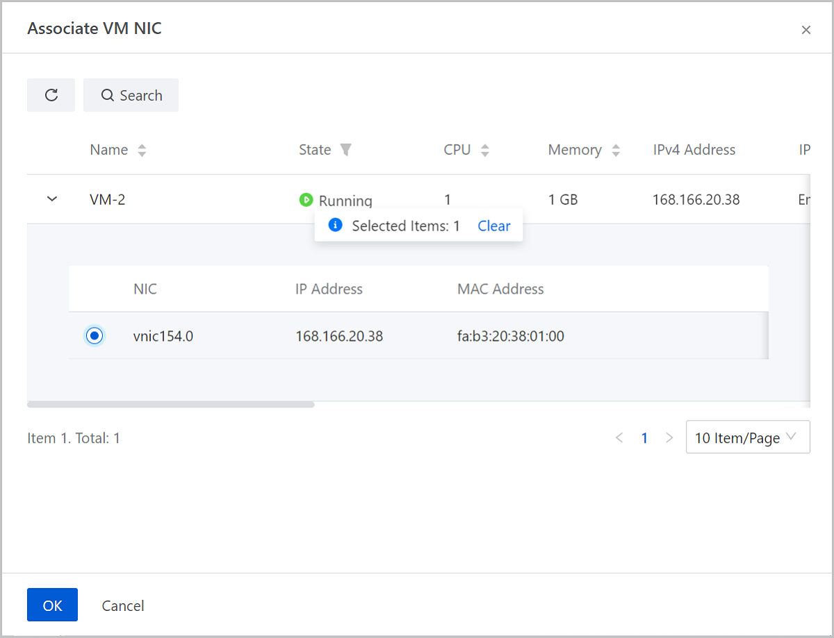 Note: On the displayed Associate VM NIC page, choose the target VM Instance. On the VM NIC page, select the target vCenter VM NIC, and click OK.
