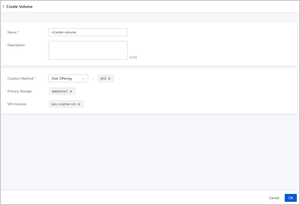 | Create vCenter Volume | Create a new vCenter volume via a disk offering or a volume image. |
