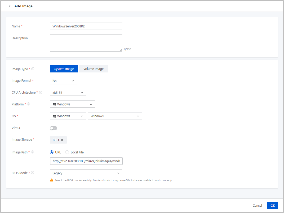 Add a Windows Server 2008 R2 image to ZStack Cloud. This image is used to install the operating system.