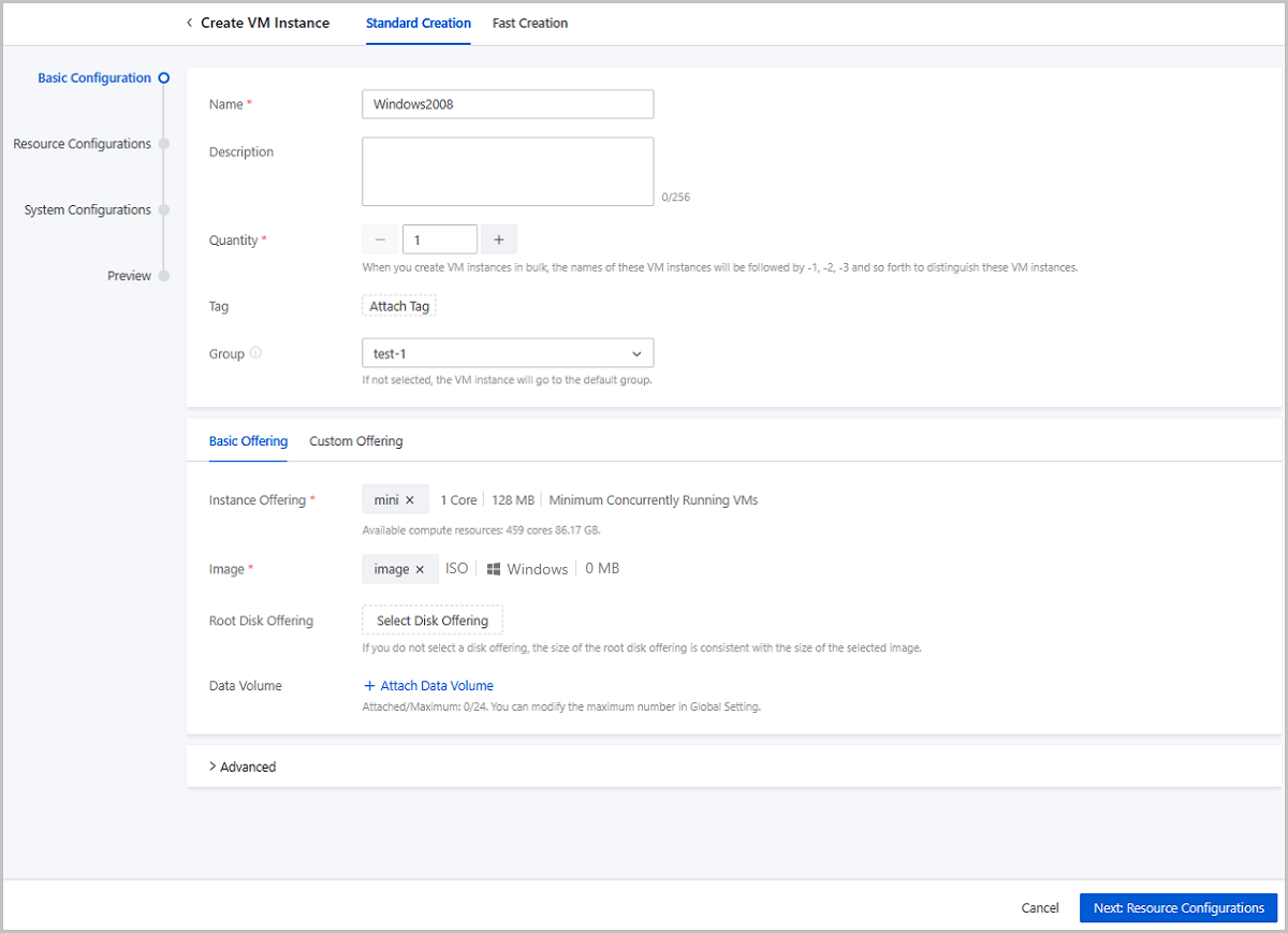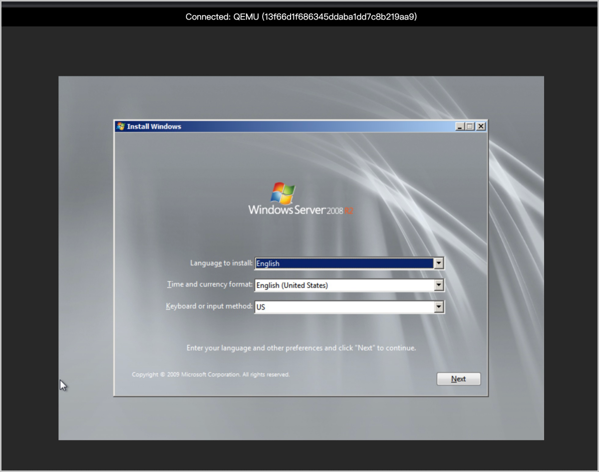 On the Preview page, click OK. Then, the Windows Server 2008 VM instance is created. The operating system will automatically enter the BIOS mode.
