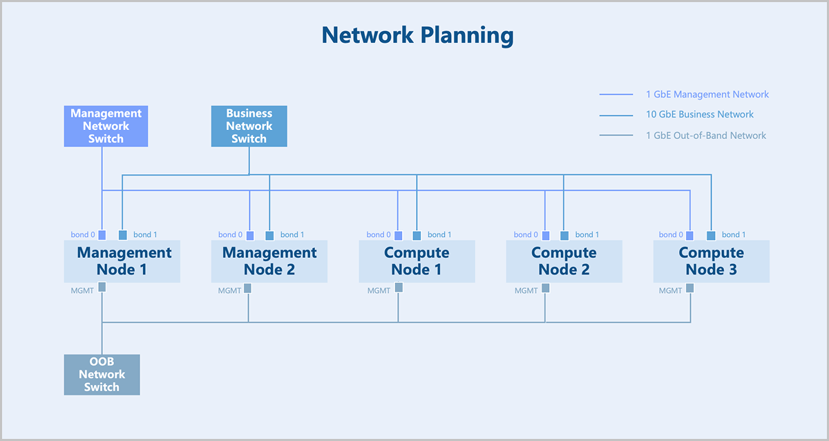 • The management network uses dual Gigabit networks for managing hardware resources related to the virtualization platform. The business network uses dual 10-Gigabit networks for virtual machine service traffic. You can configure network speeds based on your actual business requirements.
