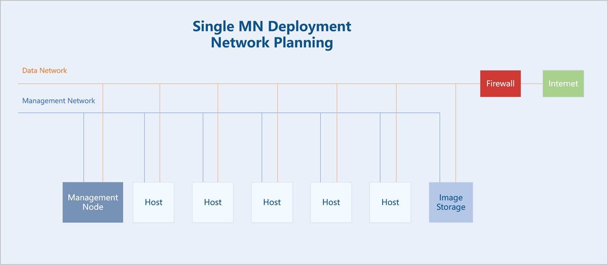 Each server connects to both the management network and the data network, with the data network providing internet access through a firewall. The management network is used for managing virtualization resources such as hosts, virtual machines, and disks, while the data network is dedicated to providing data services for virtual machines.