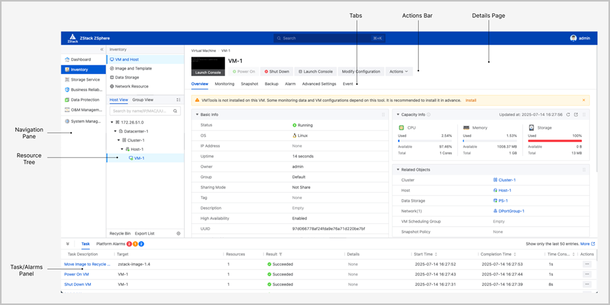 The user interface of ZStack ZSphere is designed to streamline resource management, offering intuitive navigation and intelligent contextual views for efficient resource creation, monitoring, and operations.