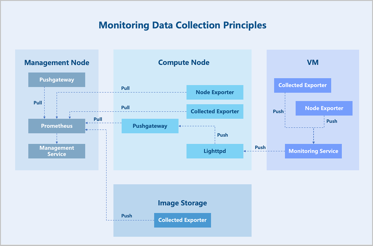In the Prometheus architecture, the Prometheus server does not directly monitor specific targets. Its core functions are data collection, storage, and providing external data query support. Therefore, to acquire sample data, such as the host CPU usage, an Exporter is used to periodically gather monitoring samples. ZStack ZSphere employs both pull and push modes to collect monitoring data from different monitoring targets. When hosts or external VM metrics are the monitoring targets, the Prometheus service periodically uses the pull mode to collect data gathered by the Exporter on the hosts. Additionally, due to network or security constraints, Prometheus might not be able to directly access the interiors of VMs. In such cases, a Pushgateway acts as an intermediary to facilitate data transfer. The data collection agent still uses an Exporter to gather monitoring metrics but employs a push mode to periodically send this data to the Pushgateway. Prometheus then uses its pull mode to collect the data from the Pushgateway, thereby achieving unified data collection.