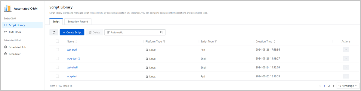 The script library stores and manages script files centrally. By executing scripts on VM instances, you can complete complex O&M operations and automated jobs.