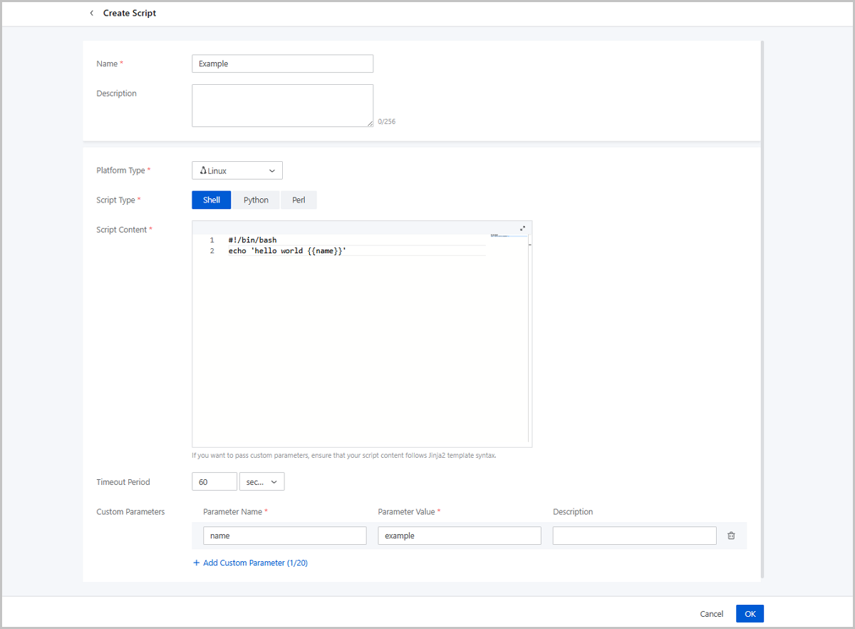 Note: The script content is encoded in Base64 for storage and transmission to ensure the data security.You can add up to 20 custom parameters to a script.