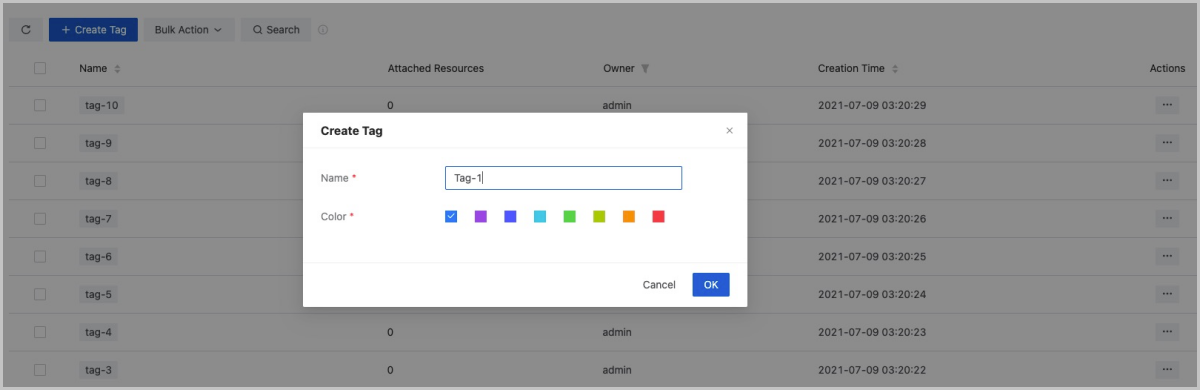 Tags created by tenants can only be attached to resources of the corresponding tenants, while admin tags can be attached to all of the resources on the Cloud.