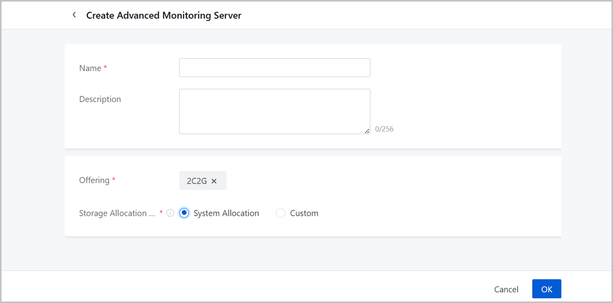 On the main menu of ZStack Cloud, choose . On the Advanced Monitoring Server page, click Create Advanced Monitoring Server. Then, the Create Advanced Monitoring Server page is displayed.