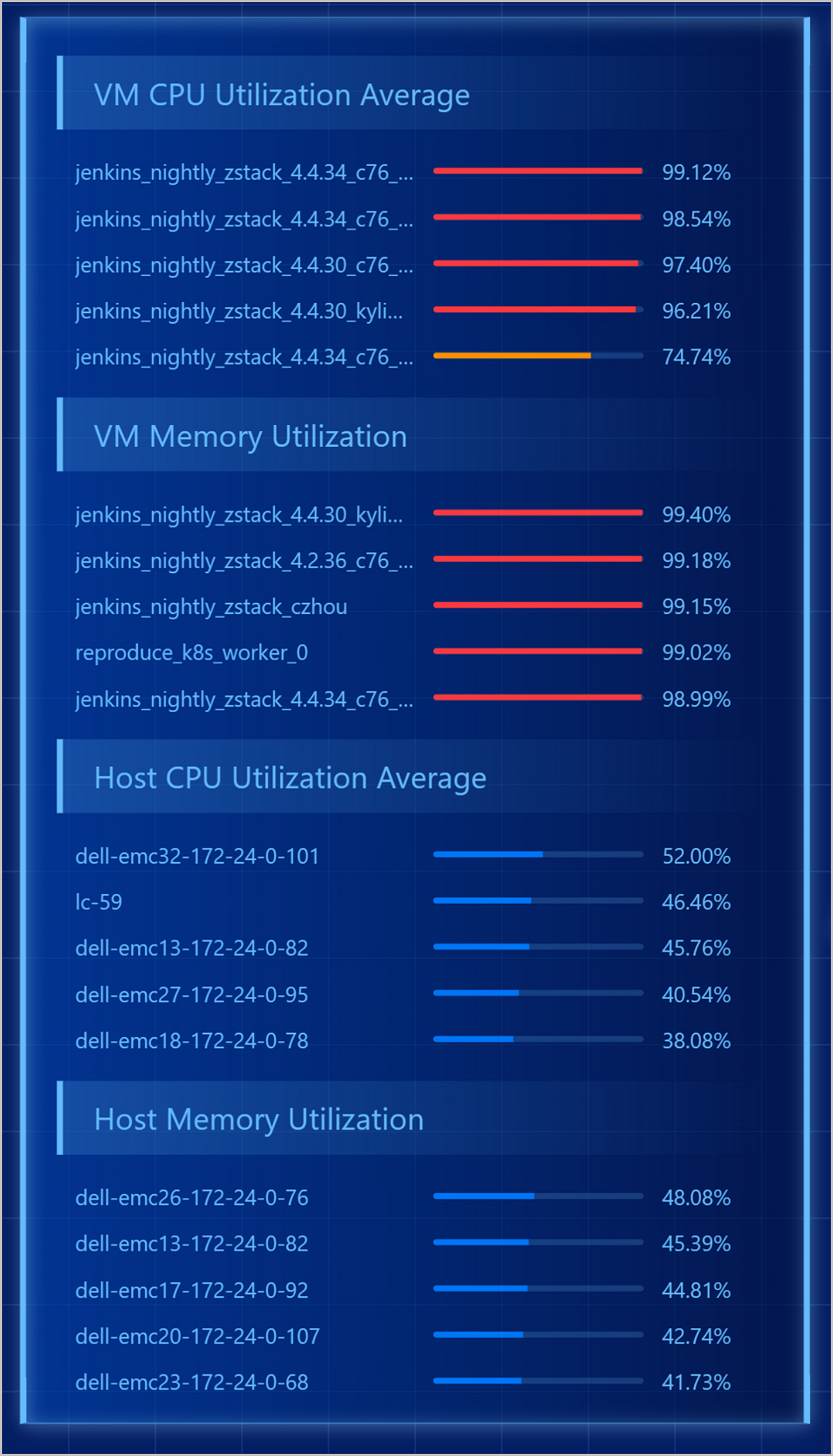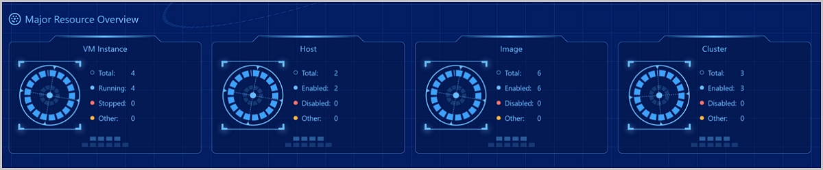 The monitor collects usage statistics on the CPU and memory of VM instances/hosts in the selected hypervisor and zone, and displays the top 5 of VM instances or hosts in real time based on VM CPU utilization, VM memory utilization, host CPU utilization, and host memory utilization. The top rankings are displayed in real time and indicated by blue, yellow, and red progress bars, so that you can easily know what resources are running out at the moment.