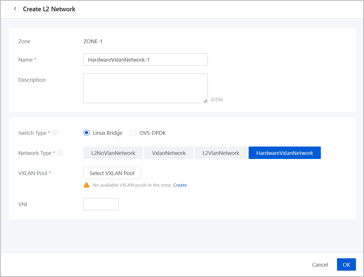 .On the main menu of ZStack Cloud, choose . On the L2 Network page, click Create L2 Network. Then, the Create L2 Network page is displayed.