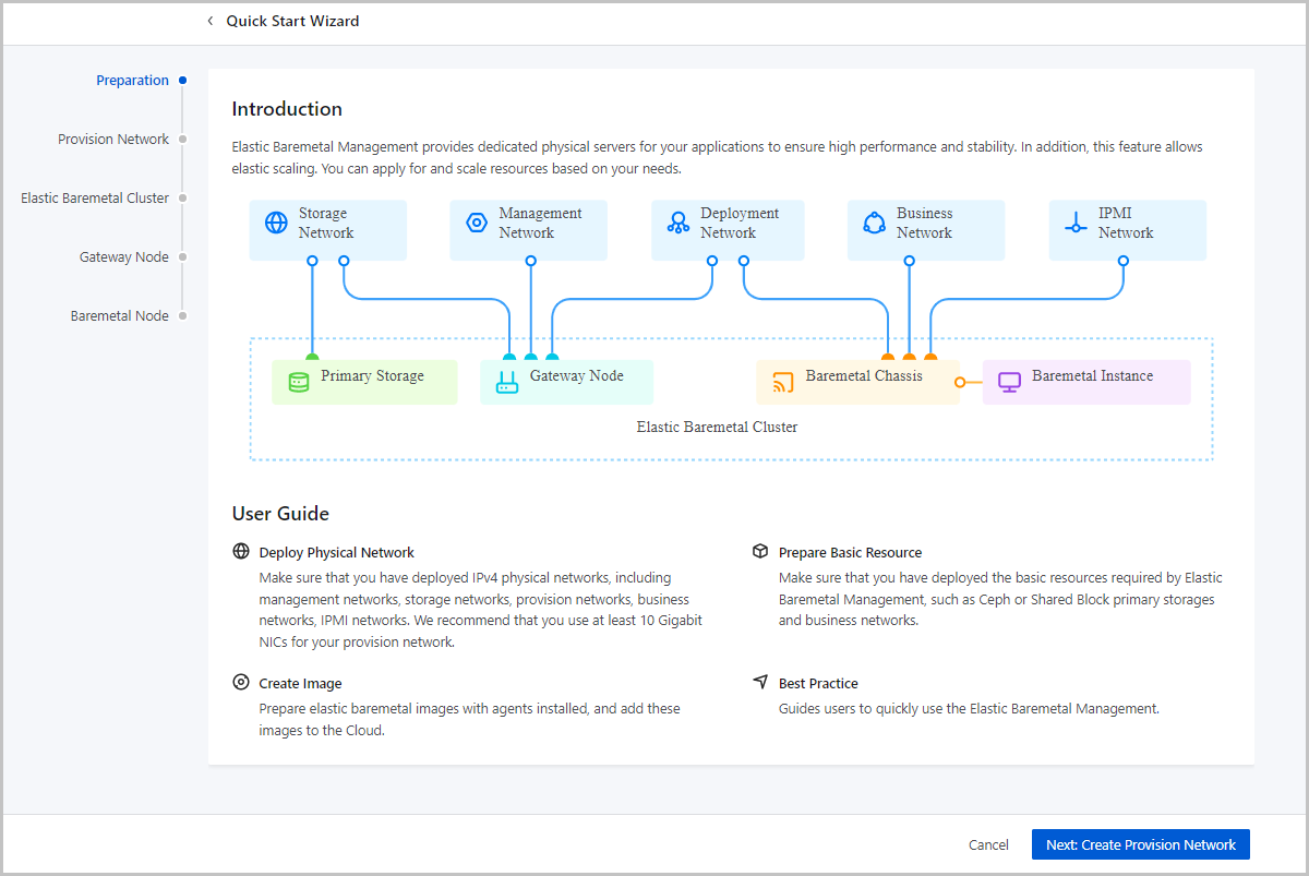 Make sure that you have deployed IPv4 physical networks, including management networks, storage networks, provision networks, business networks, IPMI networks. We recommend that you use at least 10 Gigabit NICs for your provision network.