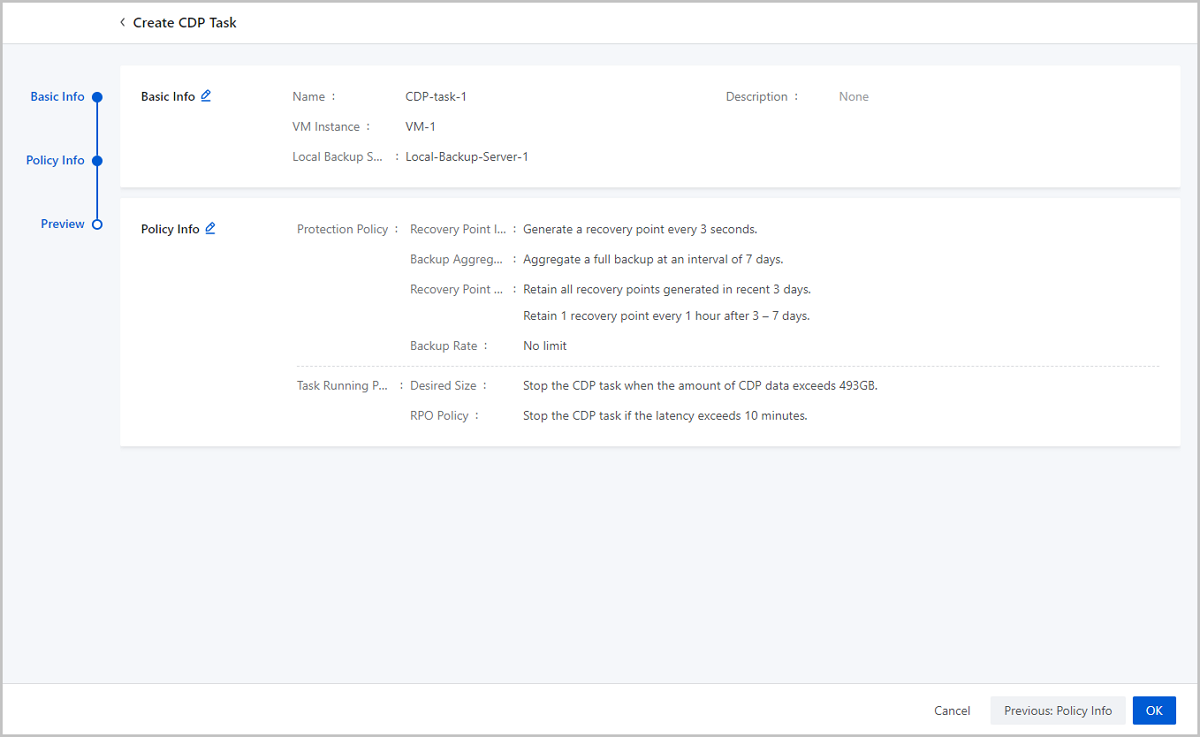 View the information about the CDP task. You can edit the information by clicking the Edit icon.