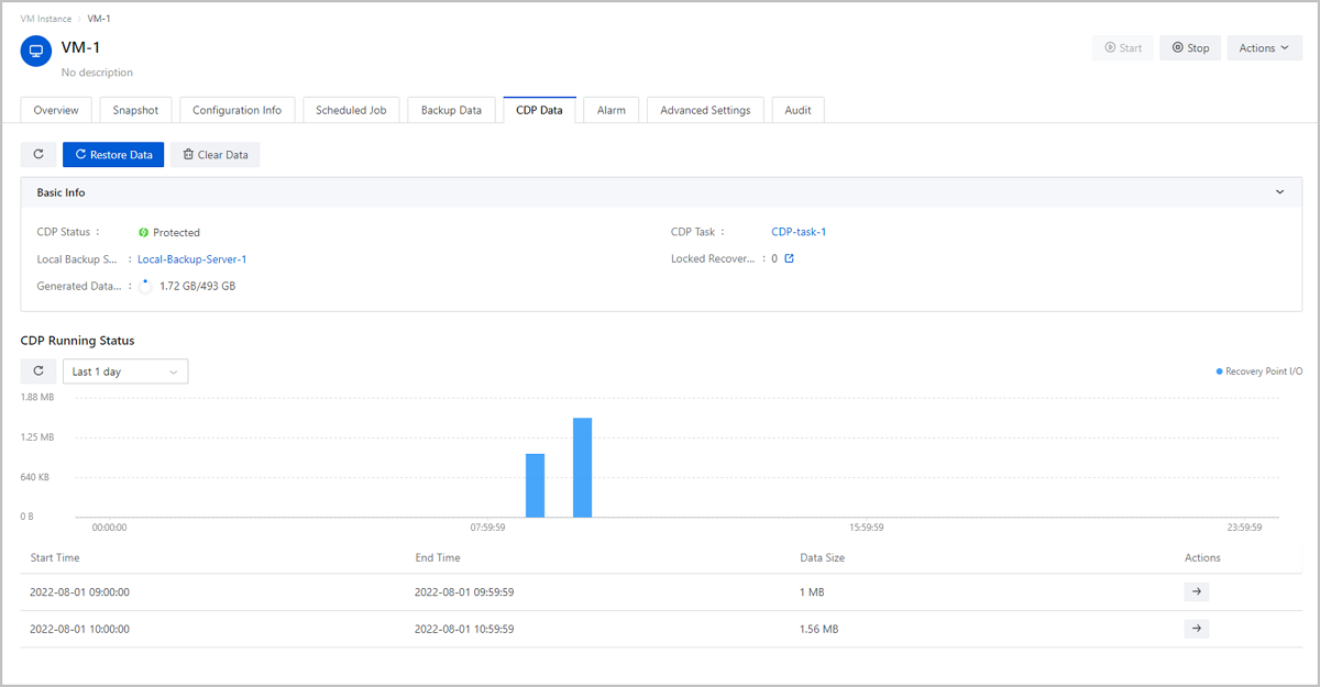 On the displayed page, find VM-1, and enter its details page. On the CDP Data tab page, view the CDP data of the VM instance.